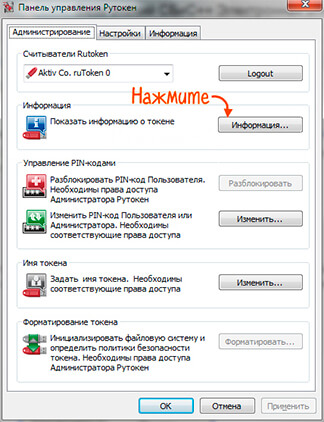 - Посмотреть информацию о носителе (имя, свободная память, информация о том, кто может менять ПИН-код);