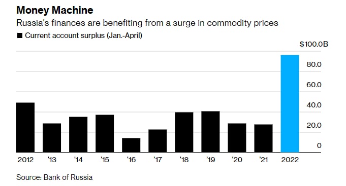 Профицит текущего счета платежного баланса РФ январе-апреле вырос в 3,5 раза до $95,8 млрд