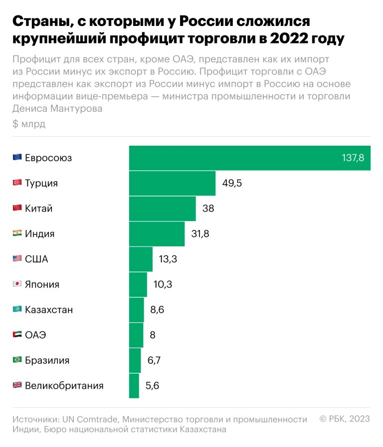 Профицит с Евросоюзом, который возглавил список, в 2022 году достиг $137,8 млрд, в Китае — $38 млрд. Показатели по Турции, Китаю и Индии составили $49,5 млрд, $38 млрд и $31,8 млрд соответственно. С США у России сложился профицит в $13,3 млрд.