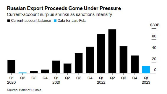 9 млрд положительного сальдо торгового баланса – уровни января-февраля 2021, примерно втрое ниже, чем в середине 2022, в 1.5 раза ниже, чем в 2018-2019 в сопоставимый период.