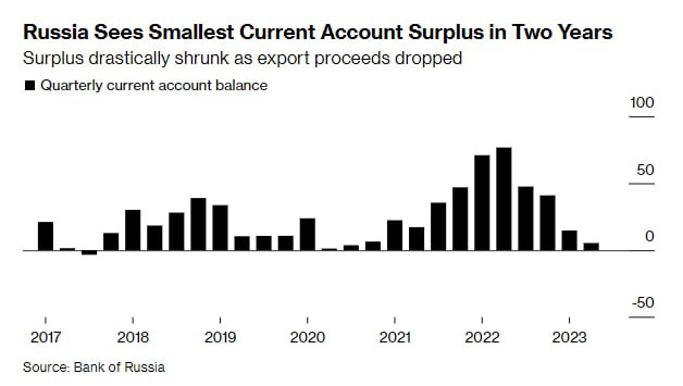 Во II квартале 2023 г ухудшение торгового баланса России до 15.6 млрд долл вызвано снижением объемов экспорта, а также падением цен, в основном на экспорт энергоносителей.