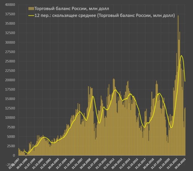 Даже со всеми ограничениями со стороны недружественных стран, торговый баланс в 2023 остается на относительно высоком уровне и лишь на 12% ниже, чем средний торговый баланс за январь-апрель с 2015 по 2021.