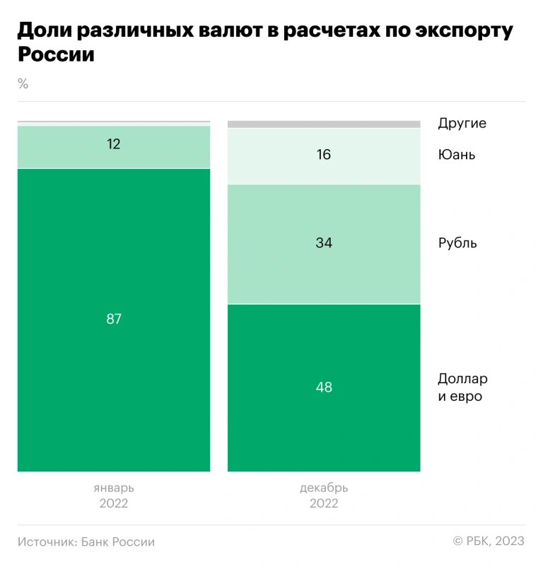 За 2022 год доля расчетов за экспорт из России в долларах США и евро сократилась, по данным ЦБ, почти вдвое — с 87% в январе 2022 года до 48% в декабре. Доля рубля в экспортных расчетах выросла за тот же период с 12 до 34%, юаня — с 0,5 до 16%. Со странами ЕАЭС расчеты ведутся преимущественно в рублях. Так, по словам инвестиционного консультанта ФГ «Финам» Тимура Нигматуллина, еще в начале 2022 года порядка 80% взаимной торговли Казахстана с Россией осуществлялось в рублях. [1]