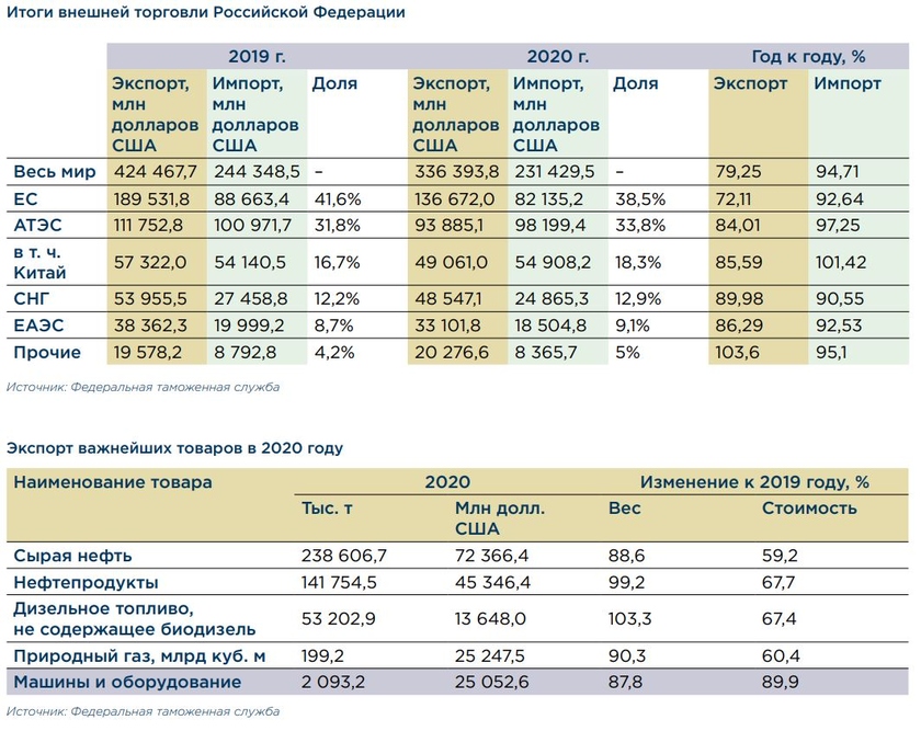 Основой российского экспорта в январе–декабре 2020 года традиционно являлись топливно-энергетические товары, удельный вес которых в товарной структуре экспорта составил 49,6% (в январе–декабре 2019 года – 62,1%). В товарной структуре экспорта в страны дальнего зарубежья доля этих товаров составила 53,8% (в январе–декабре 2019 года – 66,9%), в страны СНГ – 24,8% (28,8%). По сравнению с январем–декабрем 2019 года стоимостный объем экспорта топливно-энергетических товаров снизился на 36,6%, а физический – на 6%.
