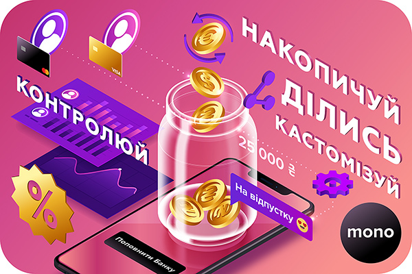 Банка – это новый сервис накопления от monobank, аналогов которому по функционалу, похоже, нет. В нем можно настроить 7 разных способов пополнения накопительного счета: 5 со своих карт, и 2 способа организовать совместный сбор средств с другими людьми, причем не только с клиентами monobank. Такого разнообразия инструментов пополнения накопительных пока нет ни у кого из банков.